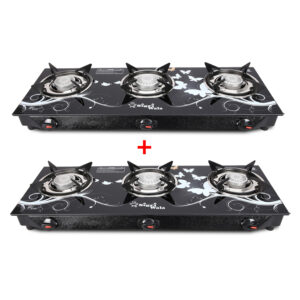 Sigri Wala 3 Burner Glass Gas Stove – Combo Set of 2, Tornado Brass Burners, Manual Ignition