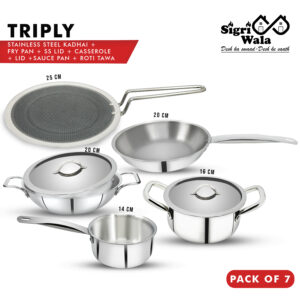 Sigri-wala Triply 7 Piece Cookware Set (Kadai, Pan, Saucepan, Casserole, Dosa Tawa , 2 SS Lid)