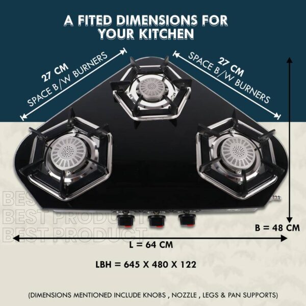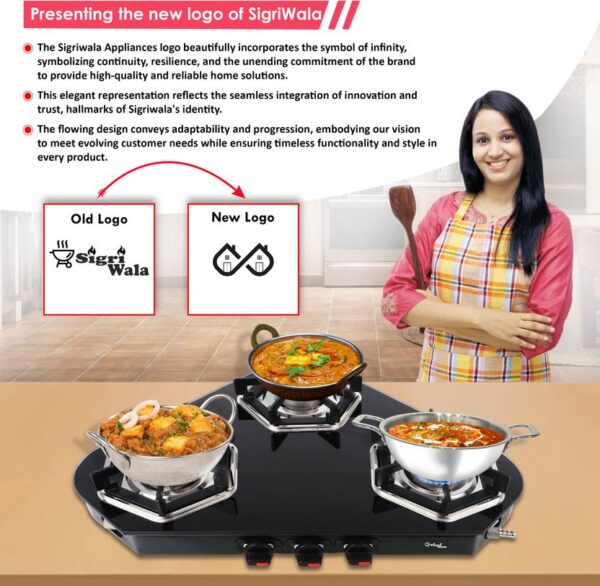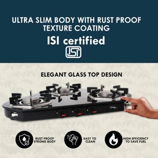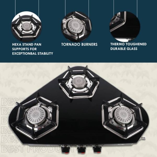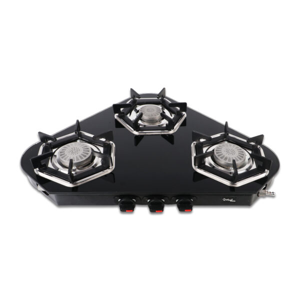 3 Burner Gas Stove | Arrow Design Glass Cooktop – Sigri-wala Surya Primecook