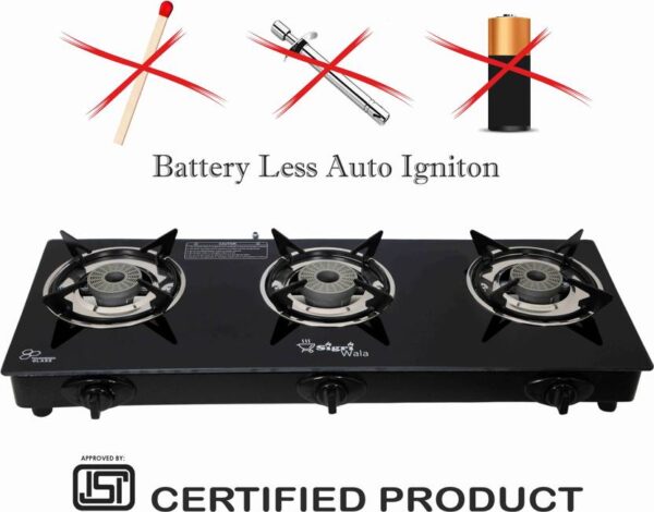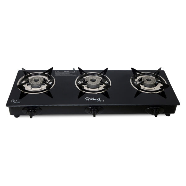 3 Burner Gas Stove | Sigri-wala Surya Primecook Automatic Royal Glass Gas Stove | Toughened Black Glass Cooktop | Aluminium Burners | Automatic Ignition LPG Stove