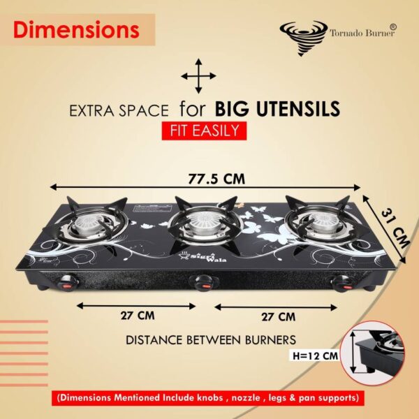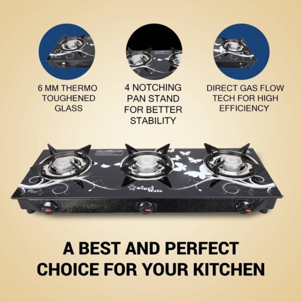 3 Burner Toughened Glass Gas Stove with Aluminium Burners