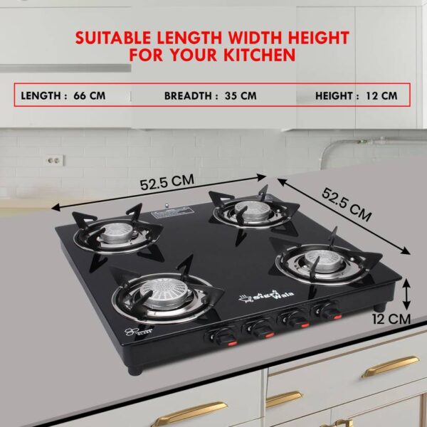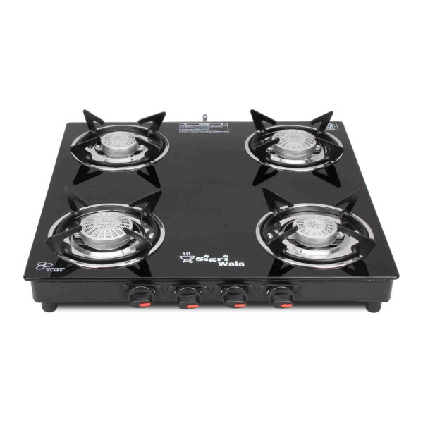 4 Burner Gas Stove | Black Toughened Glass Cooktop – Sigri-wala Surya Primecook DLX Series
