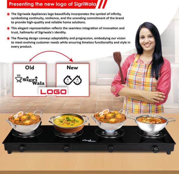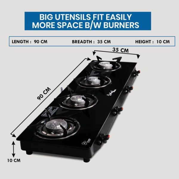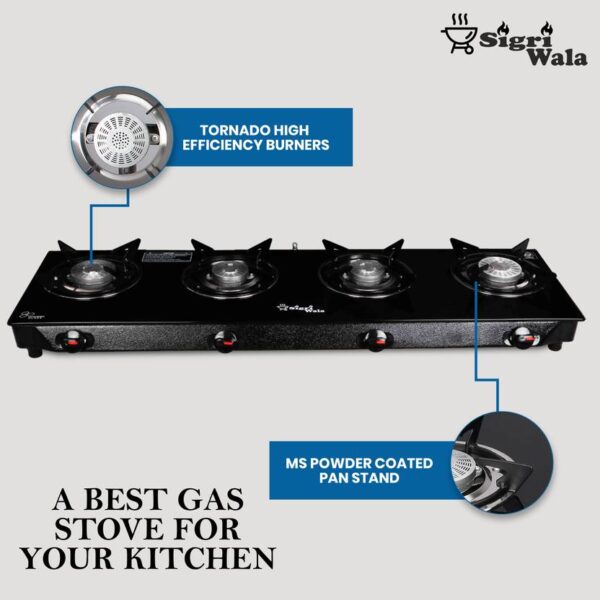 4 Burner STL Plain Toughened Glass Gas Stove | Manual, Black by Sigri-wala