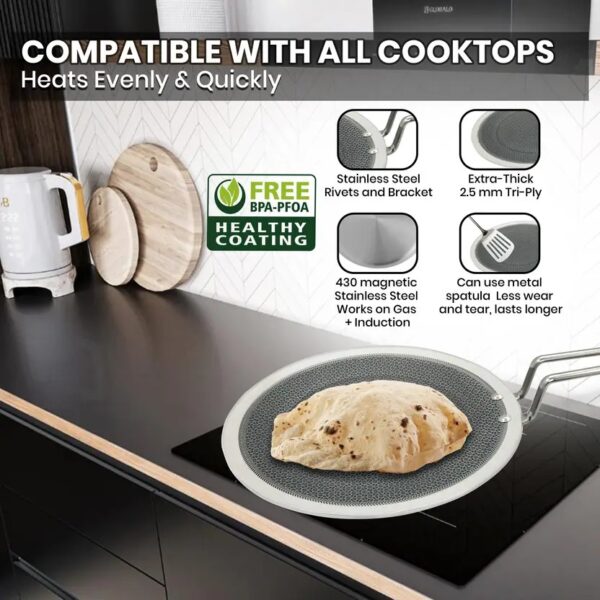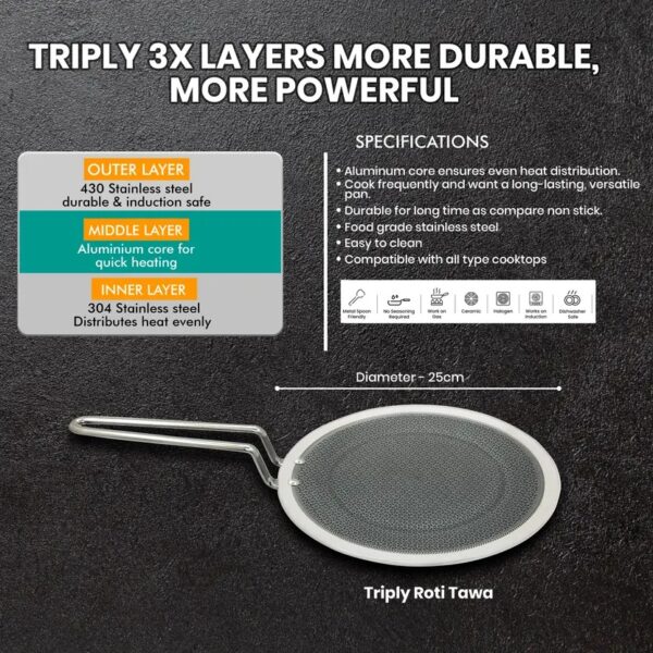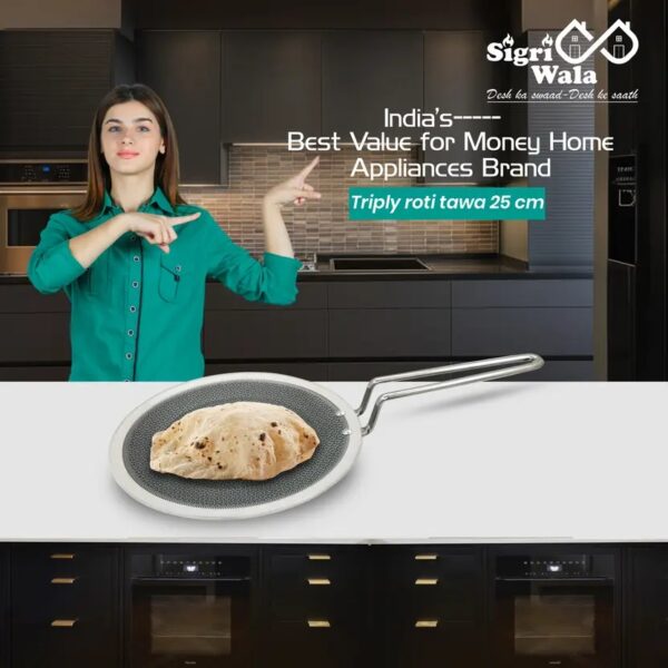 The Honey Combmesh Roti Tawa 25 cm from Sigri-wala’s Cook Healthy line combines innovative design and durability. With triply stainless steel construction and an induction-compatible base, this tawa delivers even heat distribution and consistent results right from the first use.