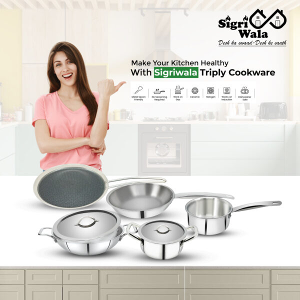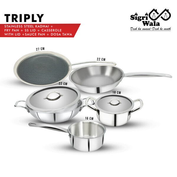 The Sigri-wala Triply 7 Piece Cookware Set brings premium performance and versatility to your kitchen. Crafted in triply (three-layer) stainless steel construction, it ensures uniform heat distribution and durability. Each piece—including a 22 cm kadai, 22 cm fry pan, 16 cm saucepan, 18 cm casserole, and 27 cm doss tawa—features induction-compatible bottoms, making them perfect for both gas and induction stoves.