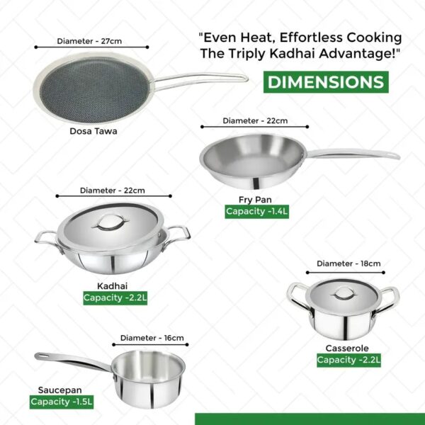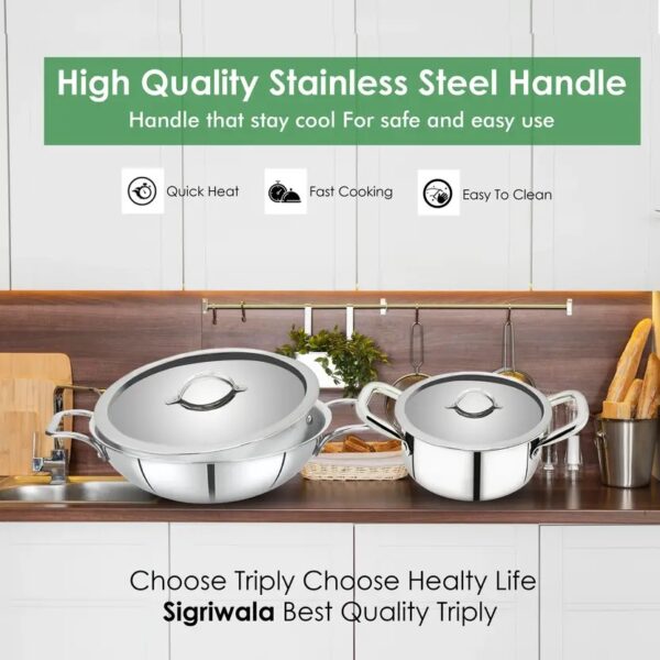 The Sigri-wala Triply 5 Piece Cookware Set brings premium performance and versatility to your kitchen. Crafted in triply (three-layer) stainless steel construction, it ensures uniform heat distribution and durability. Each piece—including a 20 cm kadai, 20 cm fry pan, 14 cm saucepan, 16 cm casserole, and 25 cm tawa—features induction-compatible bottoms, making them perfect for both gas and induction stoves.